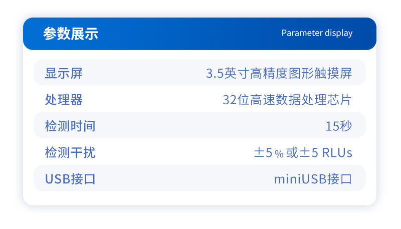 該設備為全新升級產品,大屏幕觸摸顯示屏,代替傳統按鍵。操作采用生物化學反應方法檢測ATP含量,ATP熒光檢測儀基于螢火蟲發光原理,利用“熒光素酶—熒光素體系”快速檢測三磷酸腺苷(ATP)。ATP拭子含有可以裂解細胞膜的試劑,能將細胞內ATP釋放出來,與試劑中含有的特異性酶發生反應,產生光,再用熒光照度計檢測發光值,微生物的數量與發光值成正比,由于所有生物活細胞中含有恒量的ATP,所以ATP含量可以清晰地表明樣品中微生物與其他生物殘余的多少,用于判斷衛生狀況。
