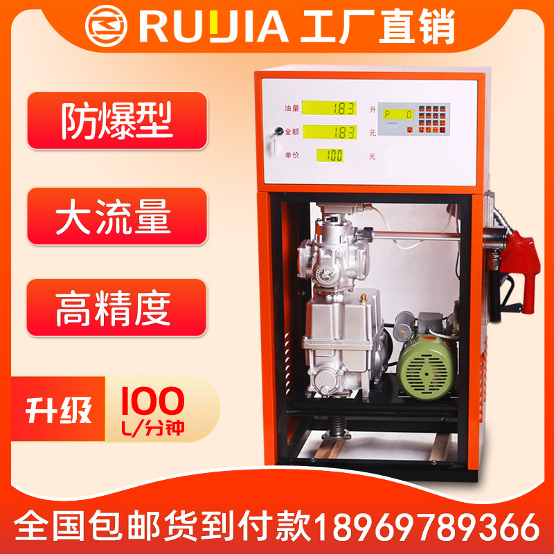 銳嘉加油機111型是一款加油站防爆柴油加油機,可加柴油和汽油,750W大功率,流量每分鐘可達60L-100L,加油機內部采用正星同款流量計和防爆組合泵裝置,安全更放心!