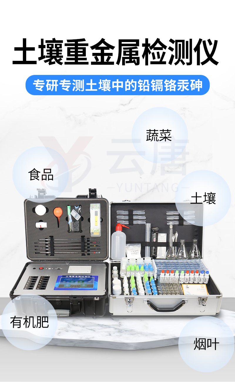 土壤重金屬污染問題日益嚴重,造成土壤耕作層內的鎘、銅、砷、鉻、汞、鐵、鋅、錳、銅、鋁等重金屬大量富積、積累,成為當下面臨的主要環境問題之一。土壤中的重金屬通過在作物體內富集進入食物鏈,對人畜健康造成嚴重威脅。有色金屬礦山的開采、 工業“三廢”的排放、含重金屬廢棄物堆積、農業生產中的污水灌溉,農用化學藥品的不合理使用等,都可能導致有害重金屬元素直接或間接進入土壤,導致土壤、作物、果蔬、水質、水產品等重金屬含量嚴重超標。但是當前重金屬測定方法測定速度慢、步驟繁瑣且儀器昂貴。基于這種形勢,我們開發出了重金屬快速測定方法。