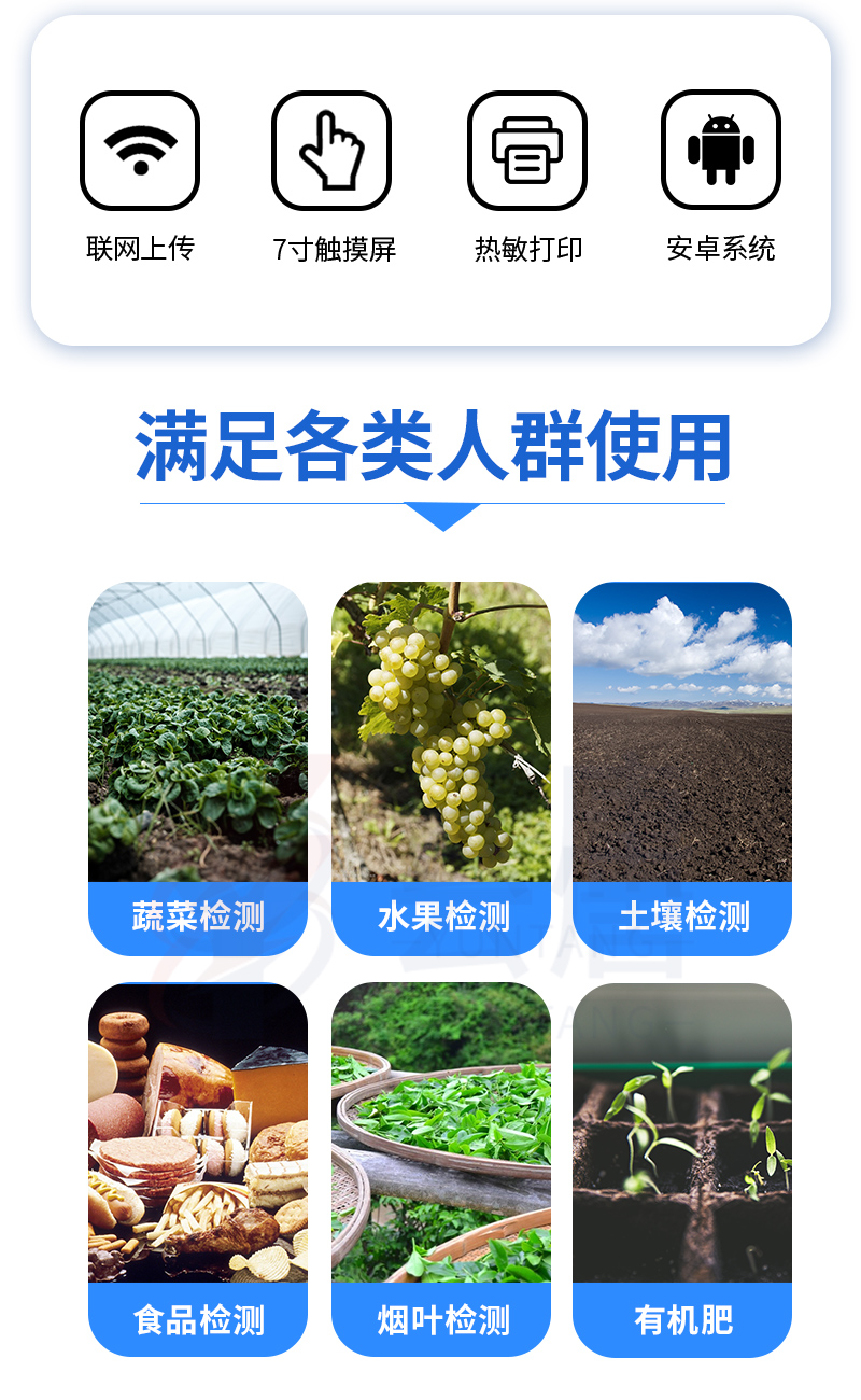 可對土壤、肥料、作物、蔬菜、水果、水質、食品等樣品中的砷、鉛、鎘、鉻、汞、鐵、鋁、鋅、錳、銅等進行快速聯合測定。