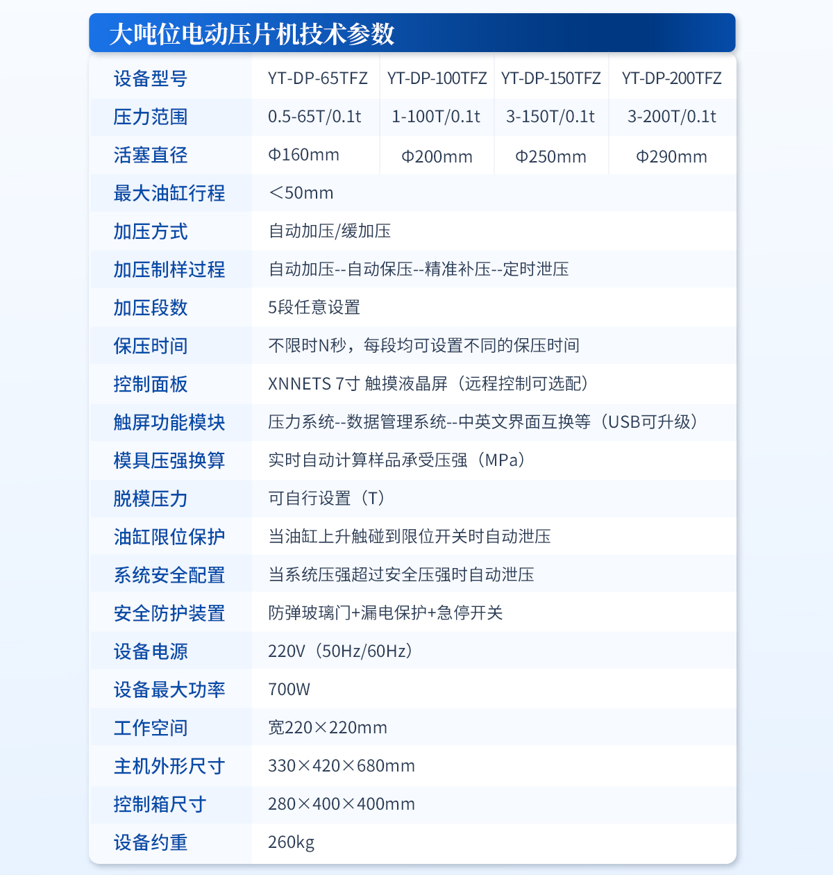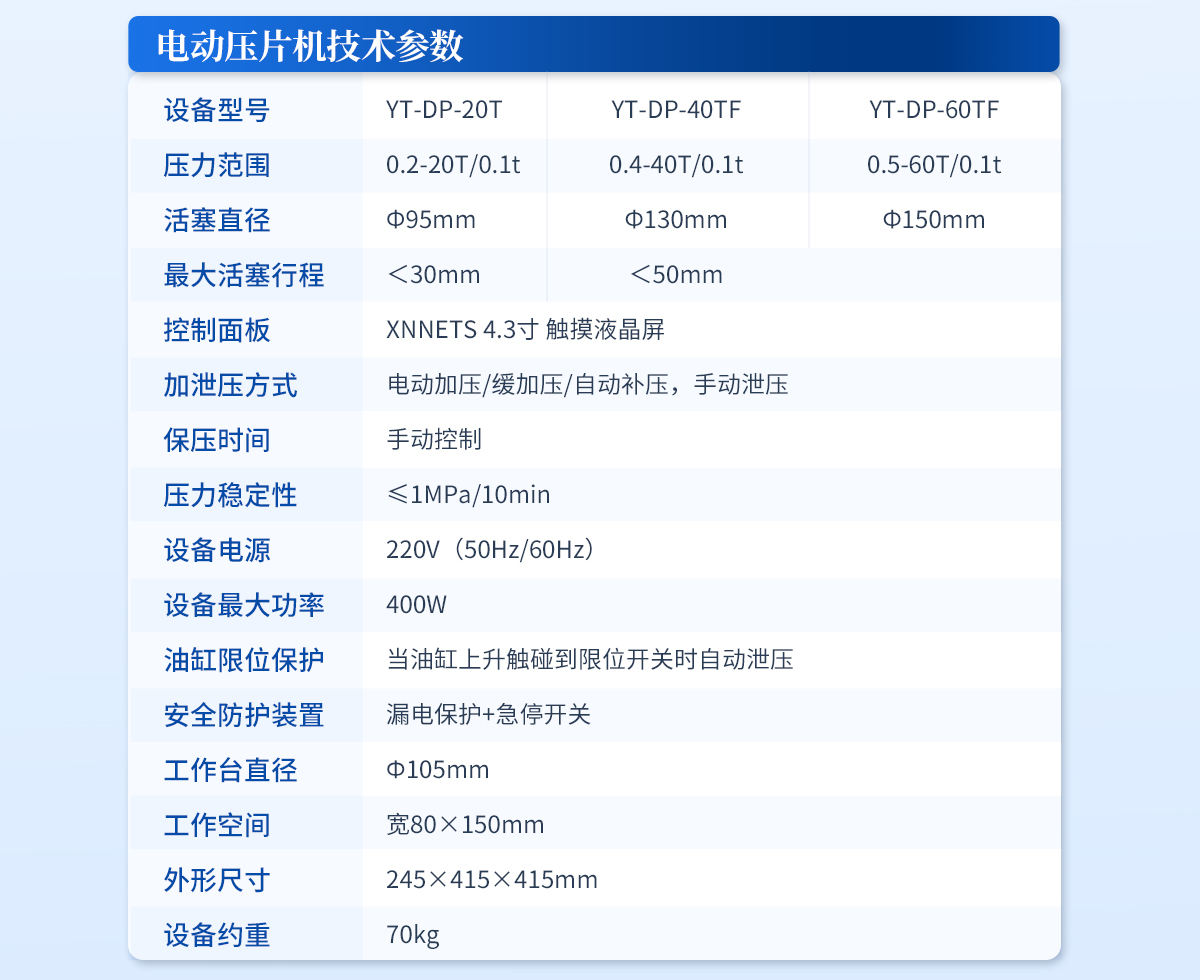 | 設備型號:YT-ZP-10TH | 壓力范圍:0.1-10T/0.1t | 壓力換算:自動 | 活塞直徑:Ф95mm | **活塞行程:<30mm | 壓力表類型:7寸 觸摸液晶屏 | 加泄壓方式:自動加壓/保壓/補壓/泄壓 | 保壓時間:不限時(N秒) | 模具壓強換算:程序自動換算 | 油缸限位保護:當油缸上升觸碰到限位開關時自動泄壓 | 系統安全配置:當系統壓強超過安全值時自動泄壓 | 安全防護配置:防彈玻璃門+漏電保護+急停開關 | 數據管理:壓力系統--數據管理系統--中英文界面互換等(USB可升級) | 設備電源:220V(50Hz/60Hz) | 工作臺直徑:Φ125mm | 工作空間:寬145×160mm | 外形尺寸:230×390×420mm | 設備重量:85kg | 配置說明:壓片機1臺,Φ13mm紅外模具1套,瑪瑙研缽1套,溴化鉀1瓶,樣品勺1個 (可拆液體池,紅外烤燈為選配) |