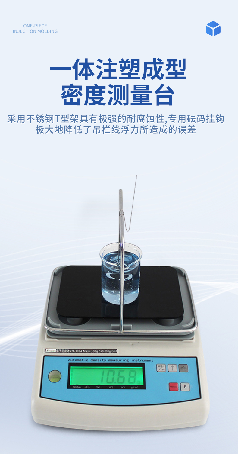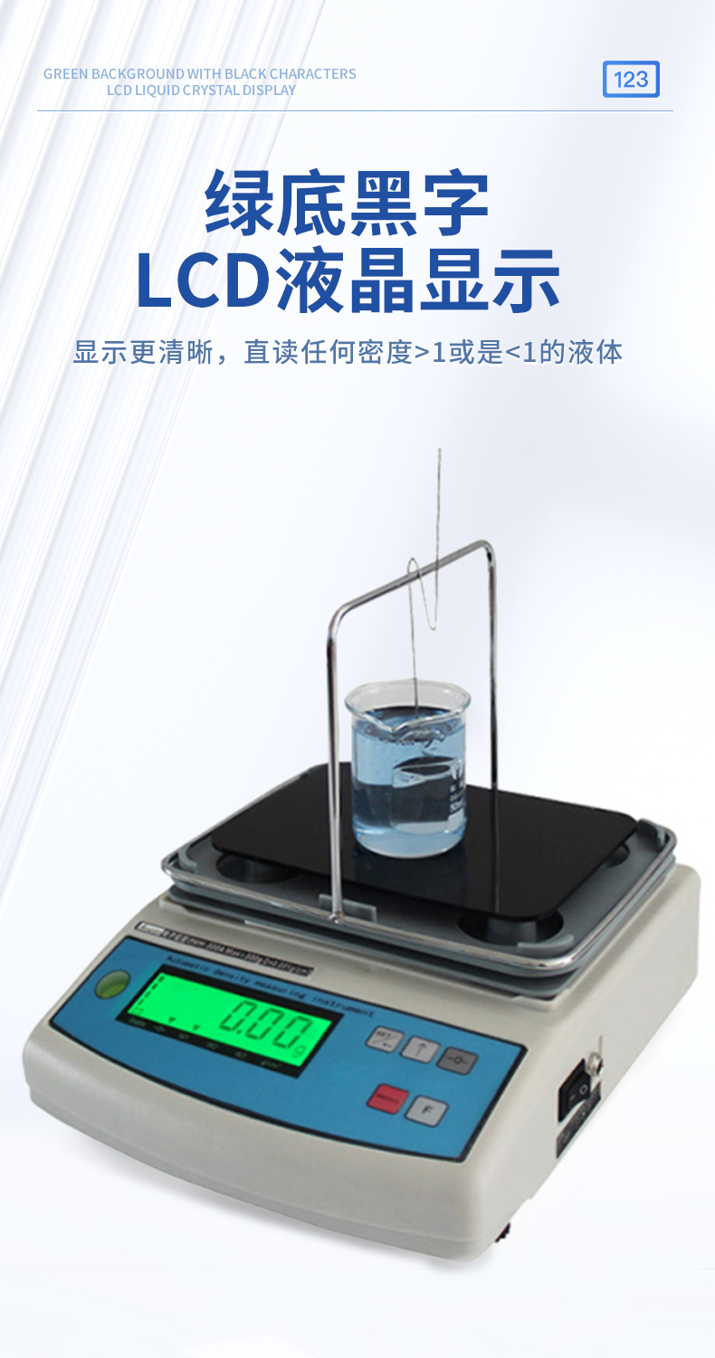 1、進入液體密度測試模式后,狀態顯示區顯示“AIR”。 將掛鉤懸掛在液體專用架正中央,按下“清零”鍵,扣除掛鉤重量。2、使用掛鉤將標準的玻璃砝碼鉤起,穩定后,按“取樣”鍵。確認玻璃砝碼在空氣中的重量時,顯示“SAV-A”,表示已記錄空氣中的重量值。3、此時狀態顯示區顯示“LIq”。取下玻璃砝碼。并取50ml待測液體樣品到燒杯中,將玻璃砝碼放入液體中。4、將燒杯放在支撐板的正中央,使用掛鉤將玻璃砝碼鉤起(確定測量液體有高于玻璃砝碼,而且玻璃砝碼不可以碰到燒杯壁),穩定后,按“取樣”鍵。確認玻璃砝碼在液體中的重量時,顯示“SAV-B”,表示已記錄液體中的重量值。5、自動顯示被測液體的密度值。按“模式”鍵,可切換顯示樣品的濃度值。7、按“設置”鍵返回到待測狀態,可進行下一組樣品的測量。(連續測試時,要將掛鉤及玻璃砝碼清潔干凈)儀器尺寸:195*220*190mm包裝尺寸:430*200*360mm包裝重量:4kg