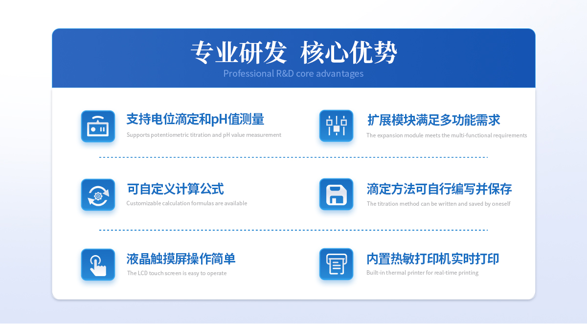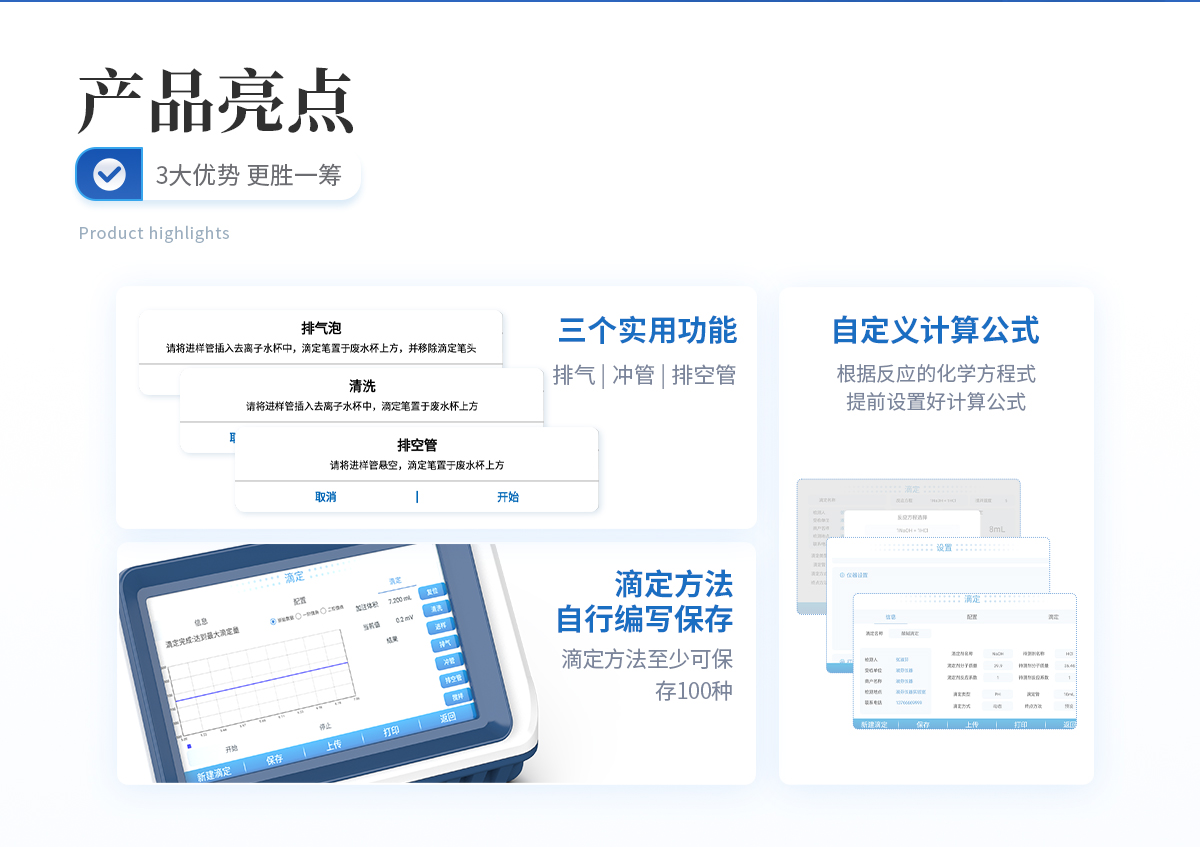 | 1、設備支持電位滴定和pH值測量;用戶選擇不同電極可進行酸堿滴定、氧化還原滴定、沉淀滴定、絡合滴定等多種滴定和pH測量; | 2、用戶可選配電導滴定、永停滴定等擴展模塊,滿足用戶多功能需求; | 3、設備對國家標準中采用的電位滴定法均滿足,用戶可根據(jù)檢測需求選擇適配的電極即可; | 4、支持動態(tài)滴定、等量滴定、手動滴定的滴定方式,可預設滴定終點或自動識別終點滴定,方便用戶根據(jù)樣品特性選擇**滴定工作流程; | 5、可自定義計算公式,根據(jù)反應的化學方程式提前設置好計算公式,滴定完成后將自動獲得待測物含量; | 6、滴定方法可自行編寫并保存,形成滴定方法快捷模式,在使用時可直接選擇運行,滴定方法至少可保存100種; | 7、設備可作為實驗室常規(guī)手動滴定的滴定裝置使用;計量泵替代滴定管,磁力攪拌功能替代手動搖晃錐形瓶的工作; | 8、儀器實用的三個功能: (1)排氣,可將滴定管或管路內(nèi)的氣泡排出,避免氣泡帶來的滴定誤差; (2)沖管,可以*少的試劑消耗量使管路內(nèi)充滿試劑,實現(xiàn)節(jié)省試劑的同時減少試劑混合引入的滴定誤差; (3)排空管,可在實驗完成后將管路中的液體收集到滴定管內(nèi),避免在拆卸管路時產(chǎn)生藥液濺灑問題。 |