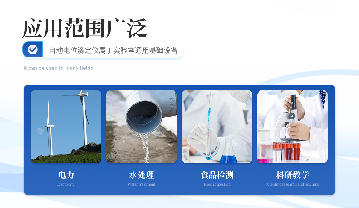 | 自動電位滴定儀屬于實驗室通用基礎(chǔ)設備,使用非常廣泛,可應用在食品、藥檢、疾控、商檢、水處理、石油、化工、海洋、電力、環(huán)保、新能源、教學、科研等相關(guān)領(lǐng)域。 |