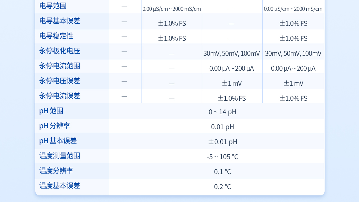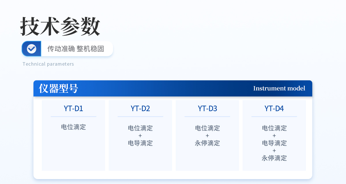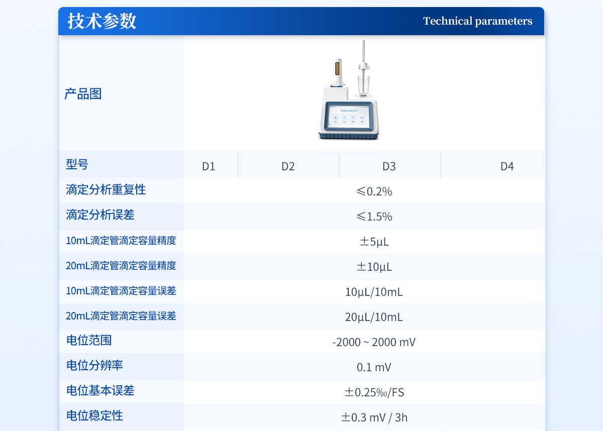 | 滴定分析重復性:≤0.2% | 滴定分析誤差:≤1.5% | 10mL滴定管滴定容量精度:±5μL | 20mL滴定管滴定容量精度:±10μL | 10mL滴定管滴定容量誤差:10μL/10mL | 20mL滴定管滴定容量誤差:20μL/10mL | 電位范圍:-2000—2000mV | 電位分辨率:0.1mV | 電位基本誤差mV:±0.25‰/FS | 電位穩(wěn)定性mV:±0.3mV/3h | 永停極化電壓:30mV、50mV、100mV | 永停電流范圍:0.00uA-200uA | 永停電壓誤差:±1mV | 永停電流誤差:±1.0% FS | pH范圍:0-14PH | pH分辨率:0.01PH | pH基本誤差:±0.01PH | 溫度測量范圍:-5 - 105℃ | 溫度分辨率:0.1℃ | 溫度基本誤差:0.2℃ |