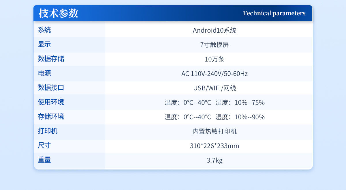 | 系統(tǒng):Android10系統(tǒng) | 顯示:7寸觸摸屏 | 數(shù)據(jù)存儲:10萬條 | 電源:AC 110V-240V/50-60Hz | 數(shù)據(jù)接口:USB/WIFI/網(wǎng)線 | 使用環(huán)境:溫度:0℃--40℃ 濕度:10%--75% | 存儲環(huán)境:溫度:0℃--40℃ 濕度:10%--90% | 打印機:內(nèi)置熱敏打印機 | 尺寸:310*226*233mm | 重量:3.7kg |